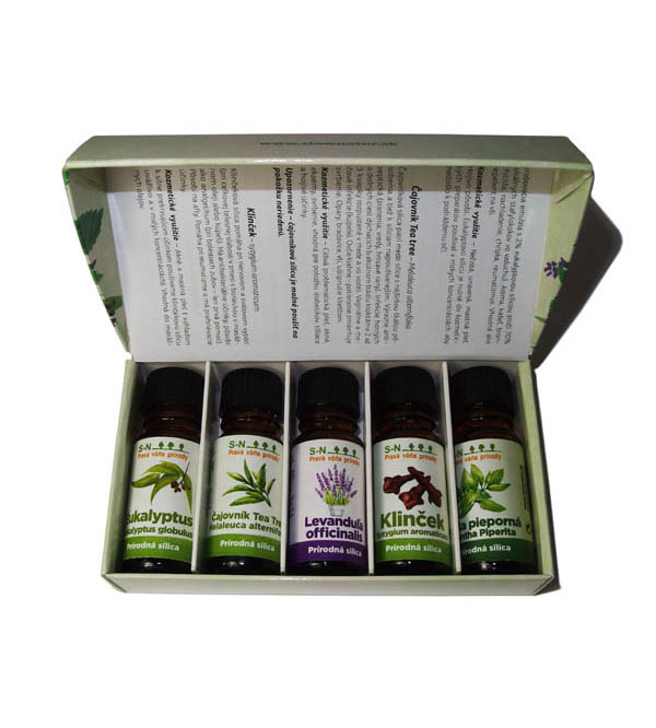 Sada esenciálních olejů – Přírodní domácí lékárnička (5 ks) je praktický balíček, který by neměl chybět v žádné domácí lékárničce. Obsahuje pečlivě vybrané 100% přírodní éterické oleje: Levandule, Eukalyptus, Hřebíček, Máta peprná a Čajovník (Tea Tree), které patří mezi základní pomocníky při běžných obtížích v domácnosti. Díky modernímu a elegantnímu balení je tato dárková sada esenciálních olejů ideální jako dárek na Vánoce, narozeniny, Den matek či Den učitelů.